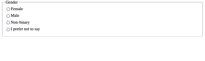 <form><fieldset><legend>Gender</legend><divclass="control"><inputid="gender_female"name="gender"type="radio"value="female" /><labelfor="gender_female">Female</label></div><divclass="control"><inputid="gender_male"name="gender"type="radio"value="male" /><labelfor="gender_male">Male</label></div><divclass="control"><inputid="gender_nonbinary"name="gender"type="radio"value="nonbinary" /><labelfor="gender_nonbinary">Non-binary</label></div><divclass="control"><inputid="gender_unknown"name="gender"type="radio"value="unknown" /><labelfor="gender_unknown">I prefer not to say</label></div></fieldset></form>