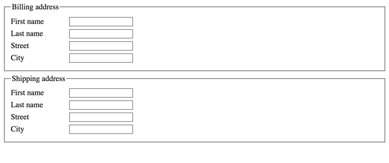 <form><fieldset><legend>Your address</legend><divclass="control"><labelfor="first_name">First name</label><inputid="first_name"type="text" /></div><divclass="control"><labelfor="last_name">Last name</label><inputid="last_name"type="text" /></div><divclass="control"><labelfor="street">Street</label><inputid="street"type="text" /></div><divclass="control"><labelfor="city">City</label><inputid="city"type="text" /></div></fieldset><fieldset><legend>Additional details</legend><divclass="control"><labelfor="biography">Biography</label><textareaid="biography"></textarea></div><divclass="control"><labelfor="image">Image</label><inputid="image"type="file" /></div><divclass="control"><labelfor="age_group">Age</label><selectid="age_group"><option>
