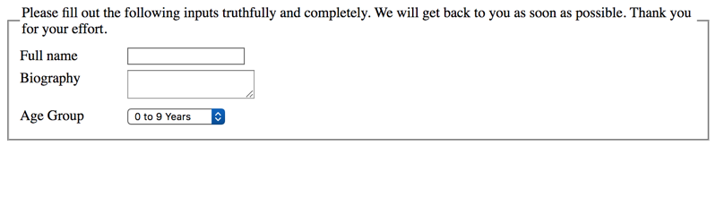 <form><fieldset><legend>Please fill out the following inputs truthfully and completely. We will get back to you as soon as possible. Thank you for your effort.</legend><divclass="control"><labelfor="name">Full name</label><inputid="name"type="text" /></div><divclass="control"><labelfor="biography">Biography</label><textareaid="biography"></textarea></div><divclass="control"><labelfor="age_group">Age</label><selectid="age_group"><option>