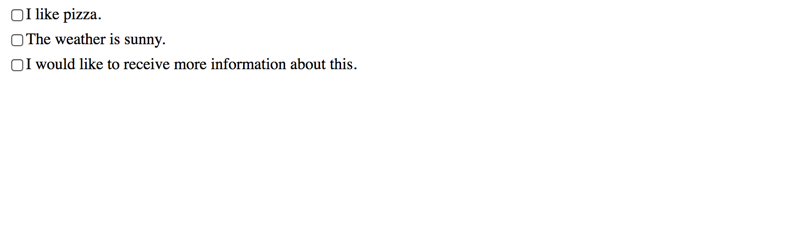 <form><divclass="control"><inputid="pizza"type="checkbox" /><labelfor="pizza">I like pizza.</label></div><divclass="control"><inputid="weather"type="checkbox" /><labelfor="weather">The weather is sunny.</label></div><divclass="control"><inputid="info"type="checkbox" /><labelfor="info">I would like to receive more information about this.</label></div></form>
