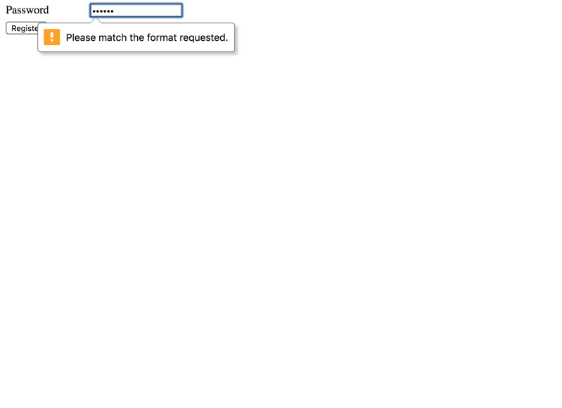 As seen in the example above, it is good practice to provide a human readable explanation of a required pattern using the title attribute. Its value will be displayed together with the browser's validation error.
