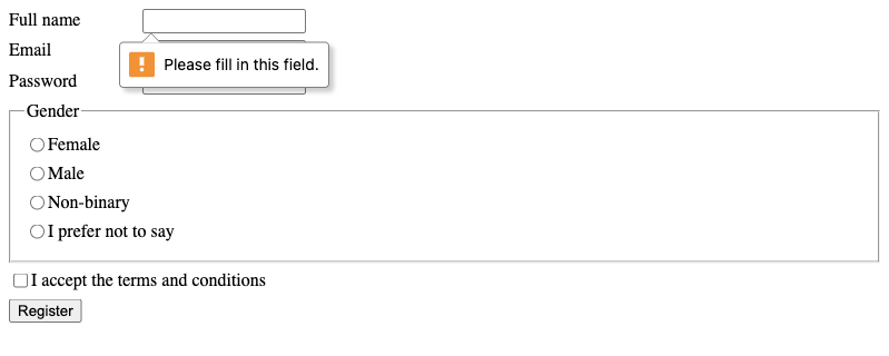 requiredattribute). - The "Email" input checks for a valid input format (using