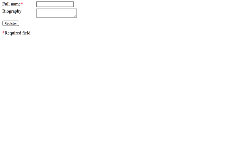 In the following example, the required input field is announced as "Full Name Asterisk" in most screen readers. An experienced user will probably know what this is intended for, but many users will have no clue.