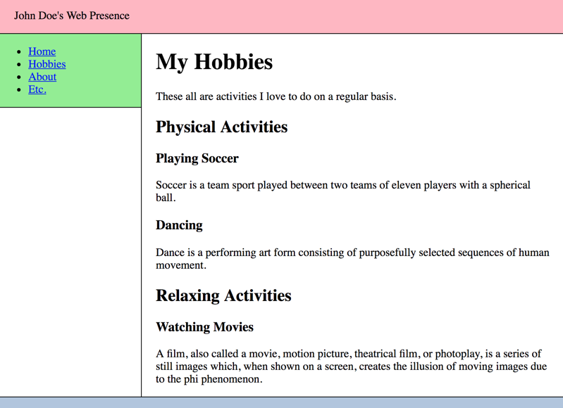 </h2><ul><li><ahref="#">Home</a></li><li><ahref="#">Hobbies</a></li><li><ahref="#">About</a></li><li><ahref="#">Etc.</a></li></ul></nav><main><h1>