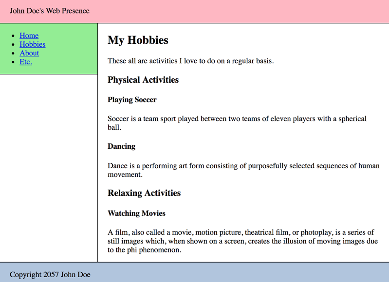 </h2><ul><li><ahref="#">Home</a></li><li><ahref="#">Hobbies</a></li><li><ahref="#">About</a></li><li><ahref="#">Etc.</a></li></ul></nav><main><h2>