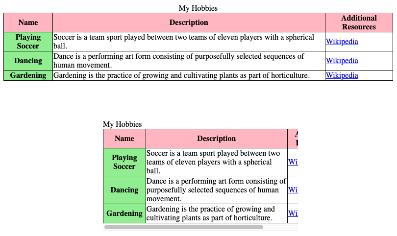 </caption><theadrole="rowgroup"><trrole="row"><throle="columnheader">Name</th><throle="columnheader">Description</th><throle="columnheader">Additional Resources</th></tr></thead><tbodyrole="rowgroup"><trrole="row"><throle="rowheader">Playing Soccer</th><tdrole="cell">