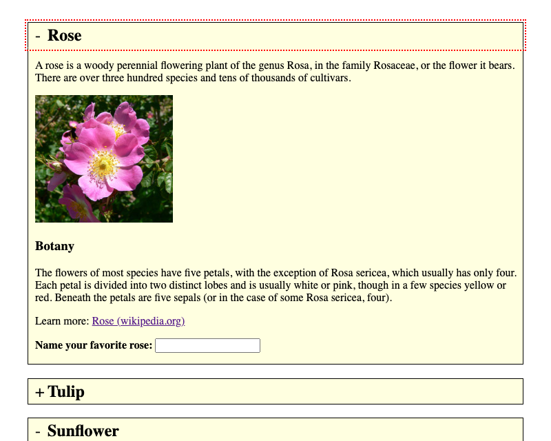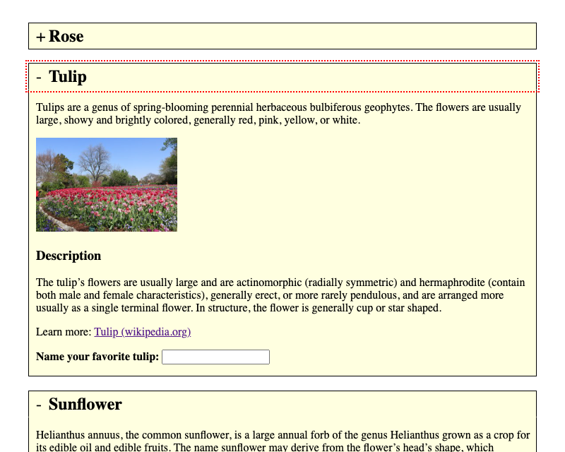 Learn more: <ahref="https://en.wikipedia.org/wiki/Rose"target="_blank">Rose (wikipedia.org)</a></p><p><labelfor="first_input"><strong>Name your favorite rose:</strong></label><inputid="first_input"type="text" /></p></section><h2class="header"><buttonaria-controls="second_item"><spanclass="visually-hidden">Show panel </span>Tulip</button></h2><sectionclass="panel"id="second_item"><p>