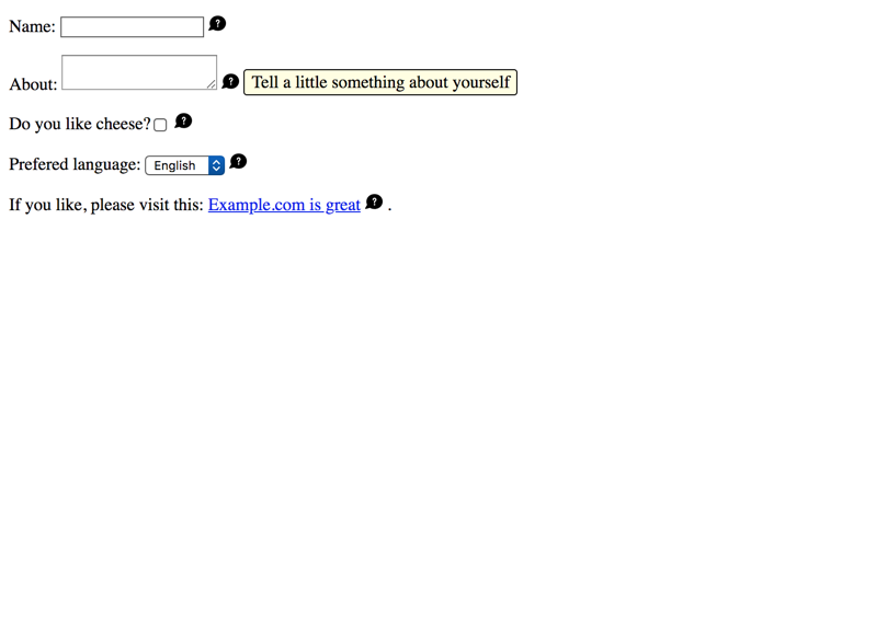 - Each form control's label gives a hint about the existence of a tooltip. This enables screen reader users to know about it in advance, so they can consult its contents before interacting with the form control (if wished).